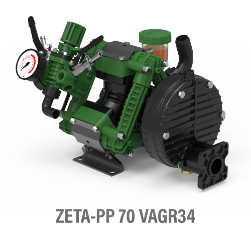 ZETA-PP low pressure 3-cylinder diaphragm pumps have anodized aluminum bodies with polypropylene heads & manifolds, and stainless steel valves. A control valve with pressure gauge is standard on all models.